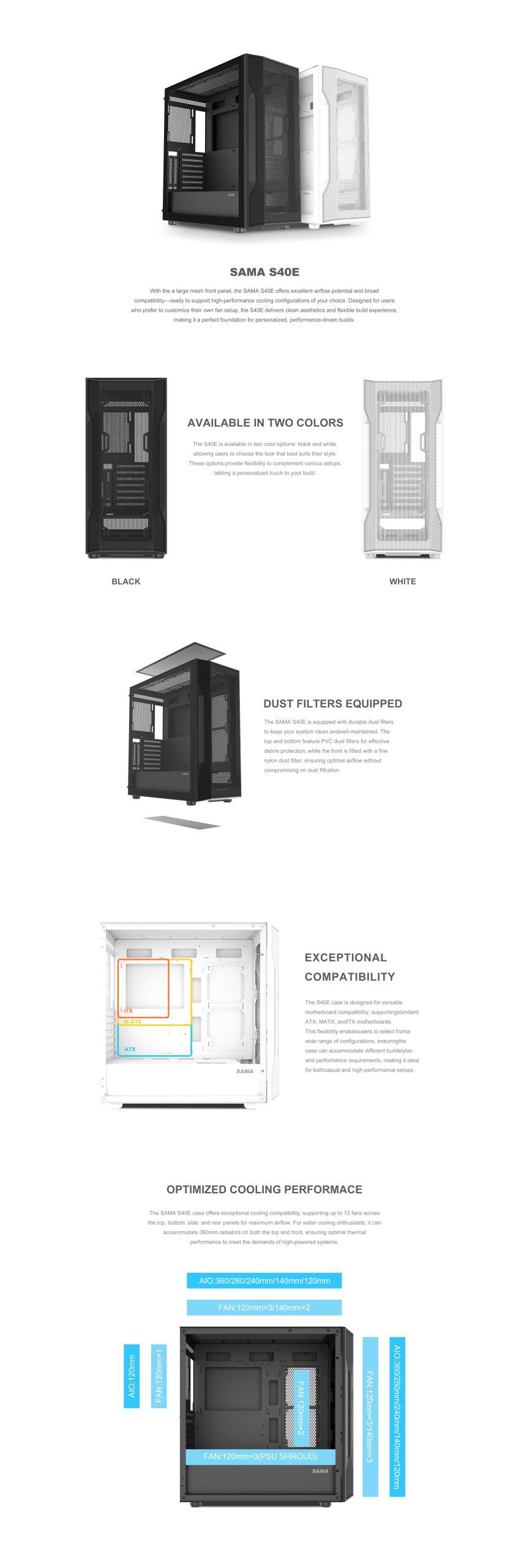 With a large mesh front panel, the SAMA S40E delivers excellent airflow and wide cooling compatibility. Designed for custom fan setups, it combines clean aesthetics with flexible, performance-focused building.