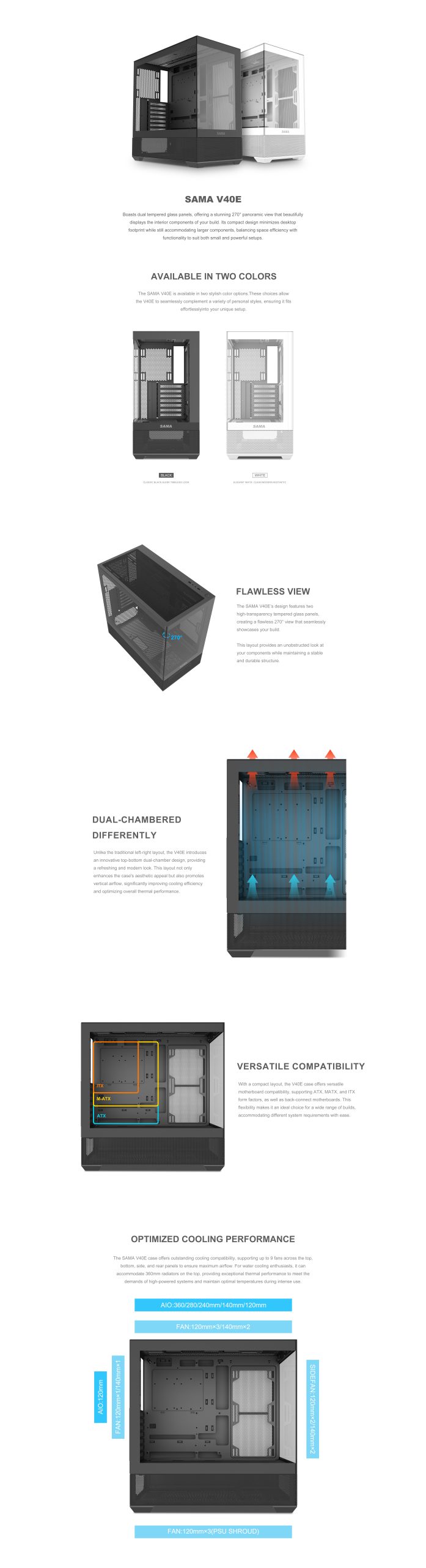 The SAMA V40E case boasts dual tempered glass panels, offering a stunning 270° panoramic view that beautifully displays the interior components of your build.