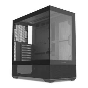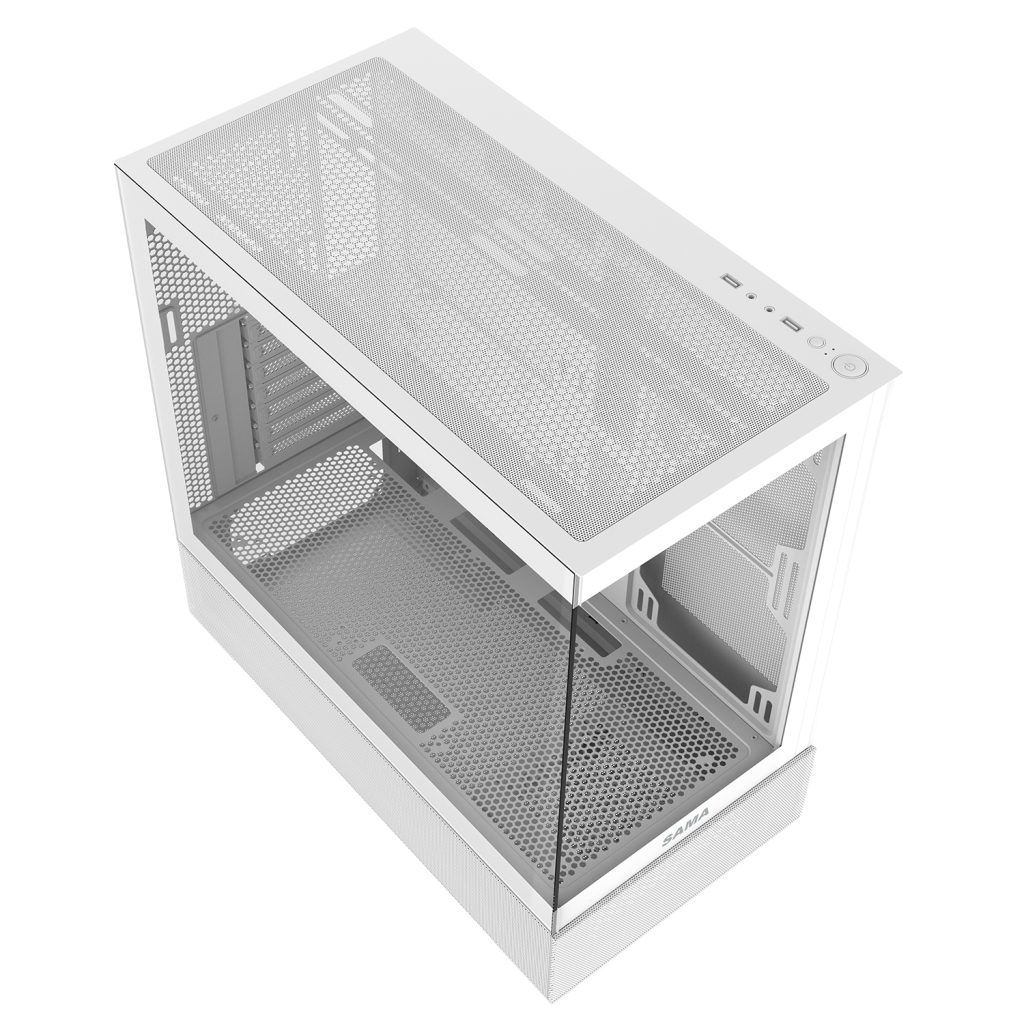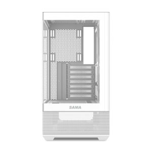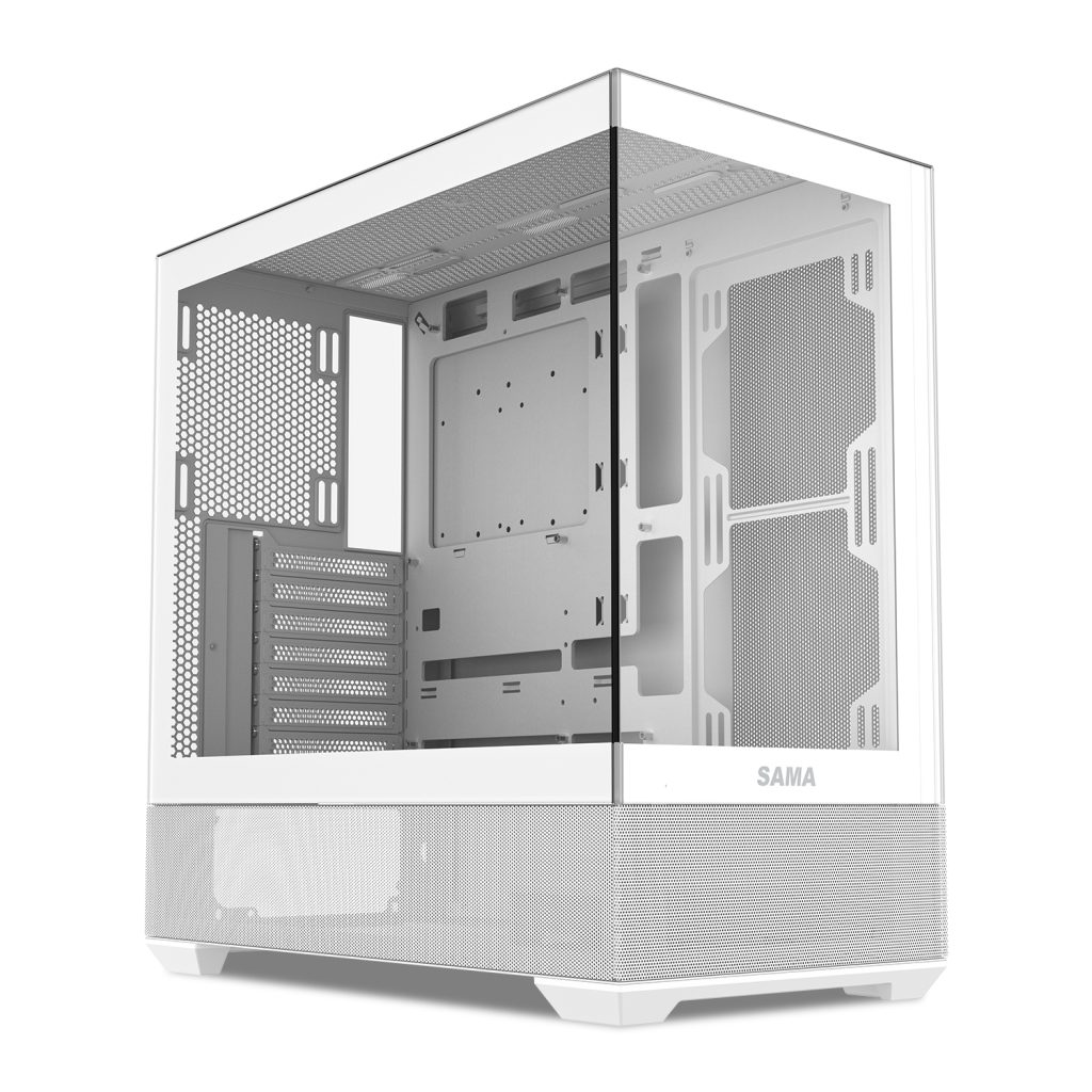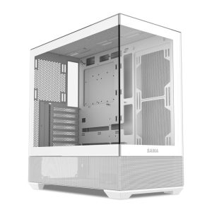 The SAMA V40E case boasts dual tempered glass panels, offering a stunning 270° panoramic view that beautifully displays the interior components of your build.